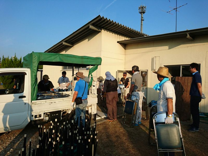 事前準備は、例年当日のお昼から取りかかっておりましたが、今年は連日の猛暑のため、前日の夕方に変更されました。 平日の夕方ではありましたが、自治会長さん、町内会長さん、たくさんの方がお手伝いにかけつけていただき、また小学生や高校生もお母さんと一緒に参加していただきました。ありがとうございます。