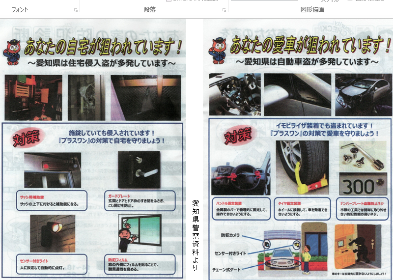 県内では相変わらず「住宅侵入盗・自動車盗・還付金等詐欺」が多発しています。愛知県警察資料を基に家の点検・防犯診断を講習しました。その後、いつもの駐車場へ移動しパトロール隊は363号線を、車両隊は校区内を巡回しました。