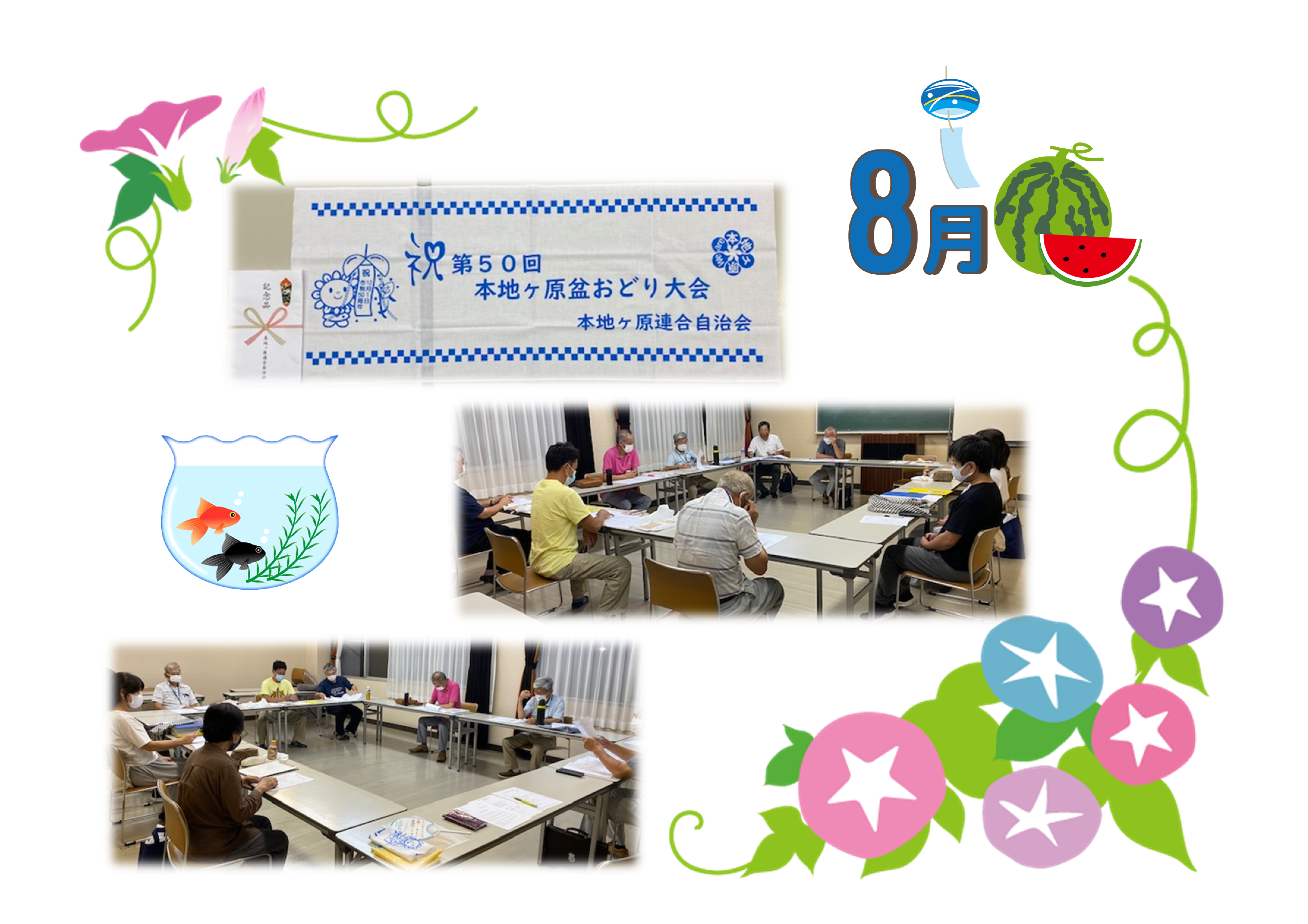 コロナウイルス感染防止のため、盆おどり大会は中止となりましたが、「50回記念大会」だったので代わりに手拭いを作りました。 会員世帯に配付いたしますので、お楽しみに! 本日、8月はやらない自治会長会議を臨時で行いました。今後の行事について準備ができましたら順次、お知らせいたします。