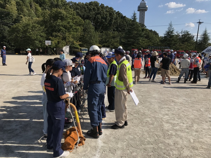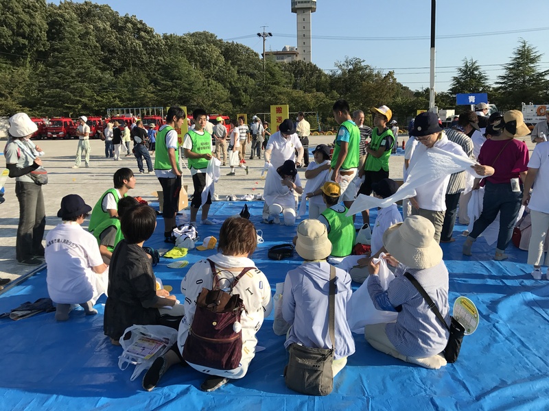 市内9校区の住民が参加し、「住民参加型訓練」と「災害対応啓発展示の見学」を行いました。 発災時、地域の住民同士で助け合う(共助)には、小中高生のマンパワーが大変重要だと言われています。本日会場では、大人に混じって真剣に訓練に取り組む小中学生の姿が多く見られ、大変心強く感じました。