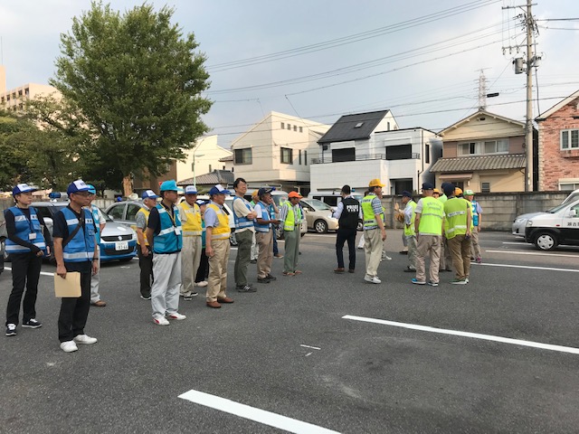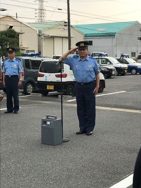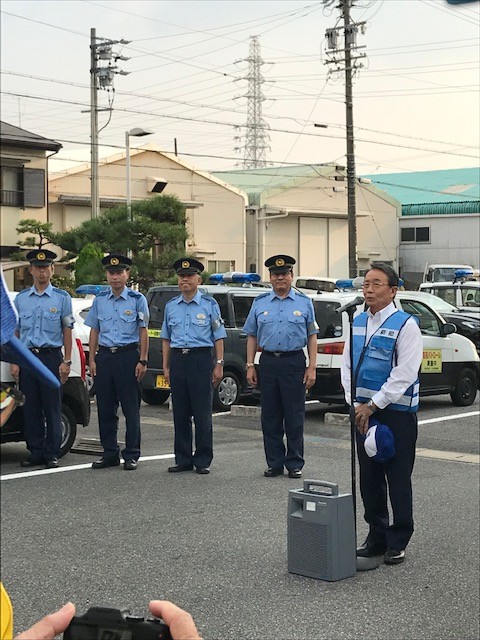 本日、守山署にて青パト隊出発式がありました。 尾張旭の9校区と守山区の青パト隊が参加し、全車が一斉に青色回転灯を回しながら帰って来ました。