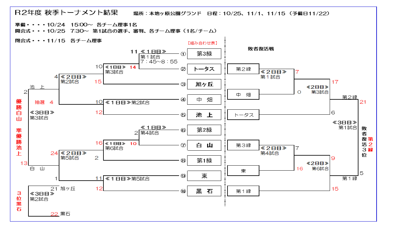 ソフトボール愛好会「秋季トーナメント大会」が、11月15日に終了しました。10月25日から熱戦が続き、優勝は「白山」・準優勝「池上」でした。