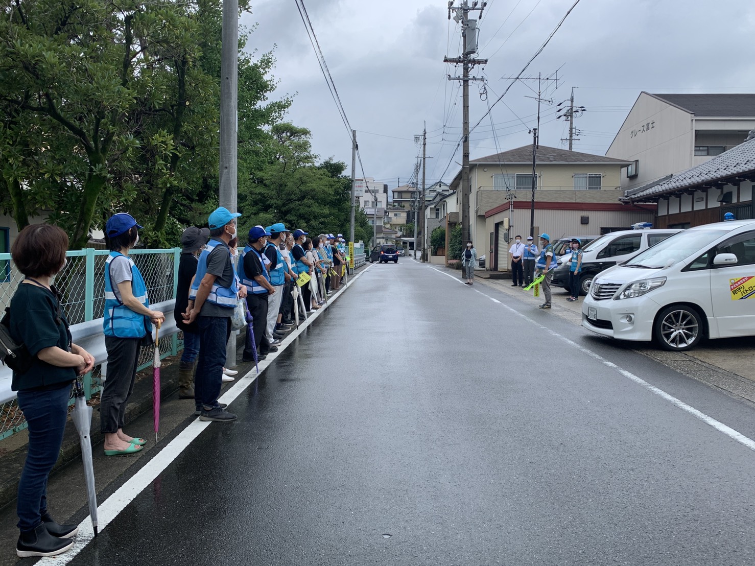 梅雨空の中、守山署、尾張旭市合同の一斉下校パトロールが、多くの方にご参加いただき開催されました。曇り空を吹き飛ばすくらい元気に下校する子どもたちの姿に、私たちも元気をもらいました。