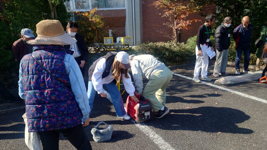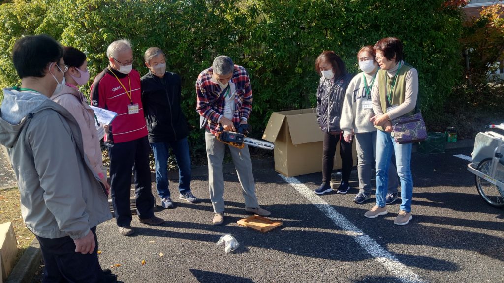 今回は、ふらっとの自治会倉庫にある防災用備品のチェックとチェーンソー等の防災機具の操作の体験をしました。