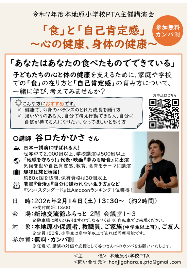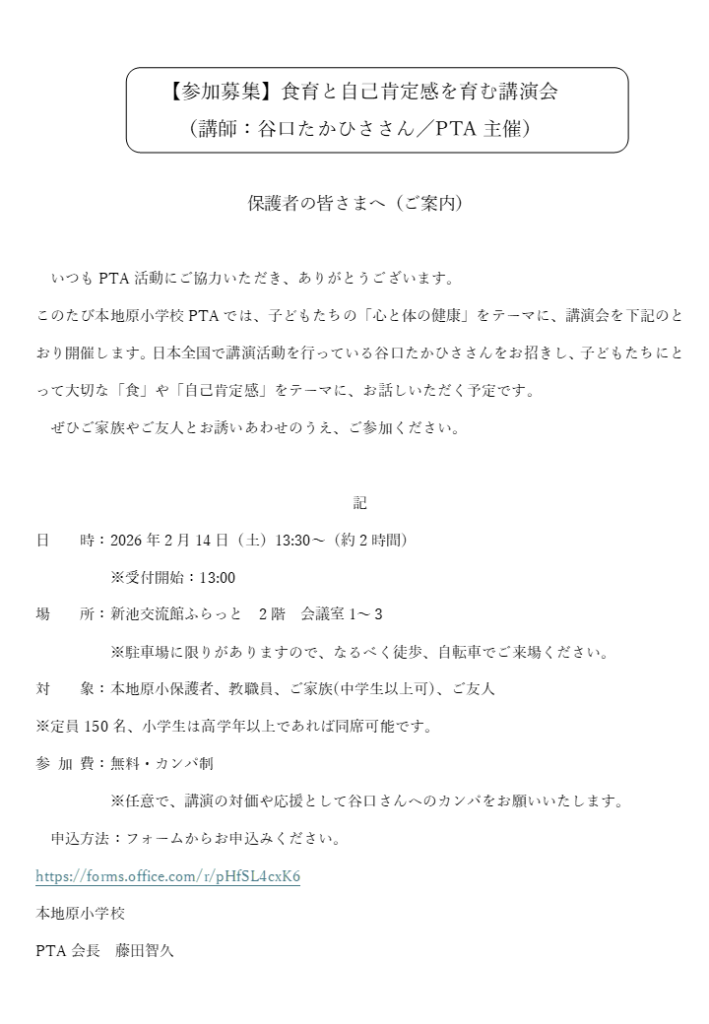 本地原小学校PTA主催講演会/「食」と「自己肯定感」心の健康、身体の健康