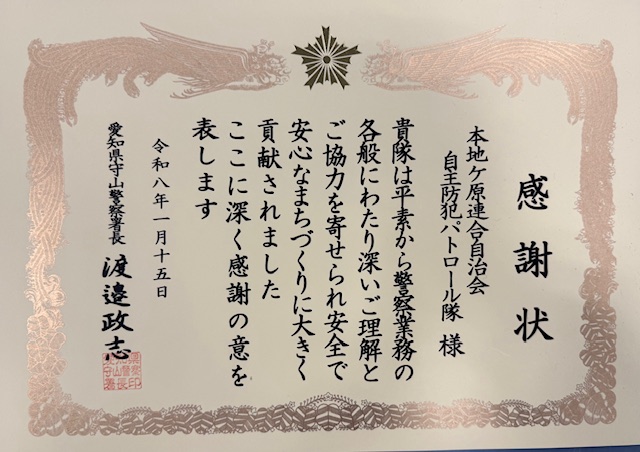 このたび、守山警察署より防犯活動に対する感謝状を賜りましたこと、誠に光栄に存じます。